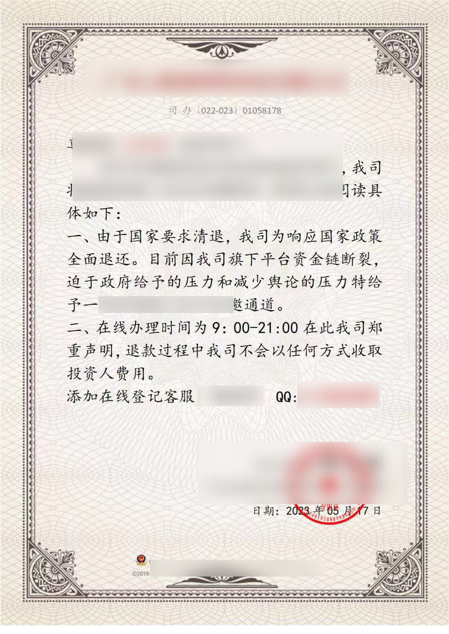 根据黑灰经的情报显示,该机构的用户数据被黑产用来诈骗,黑产团队伪装教育机构的公章文件,以清退学费等幌子招下线通过微推、彩信的方式给用户发送文件。