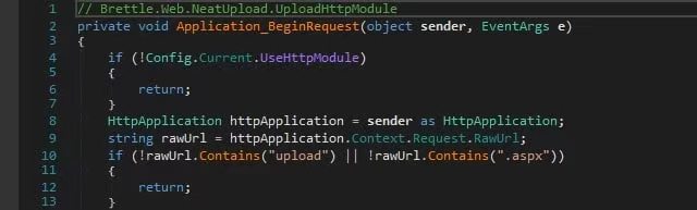 UploadHttpModule.Application_BeginRequest() – 确保 HTTP 模块实际处于活动状态(BeginRequest 事件处理程序是引发事件链中的第一个)